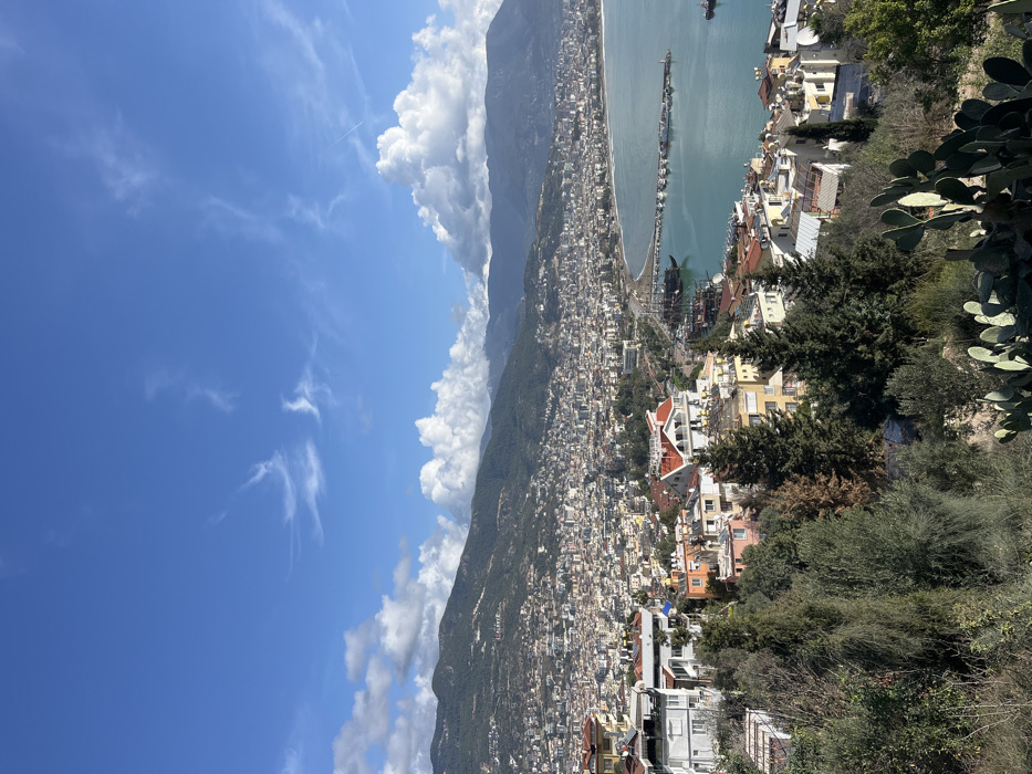A vibrant coastal city sprawls along the base of a mountain range, bordered by a clear blue sky with scattered clouds and a turquoise sea. Buildings cluster densely together, interspersed with patches of green vegetation. A harbor extends into the water, lined with ships. Lush greenery frames the urban landscape, creating a picturesque scene under the bright sunlight.