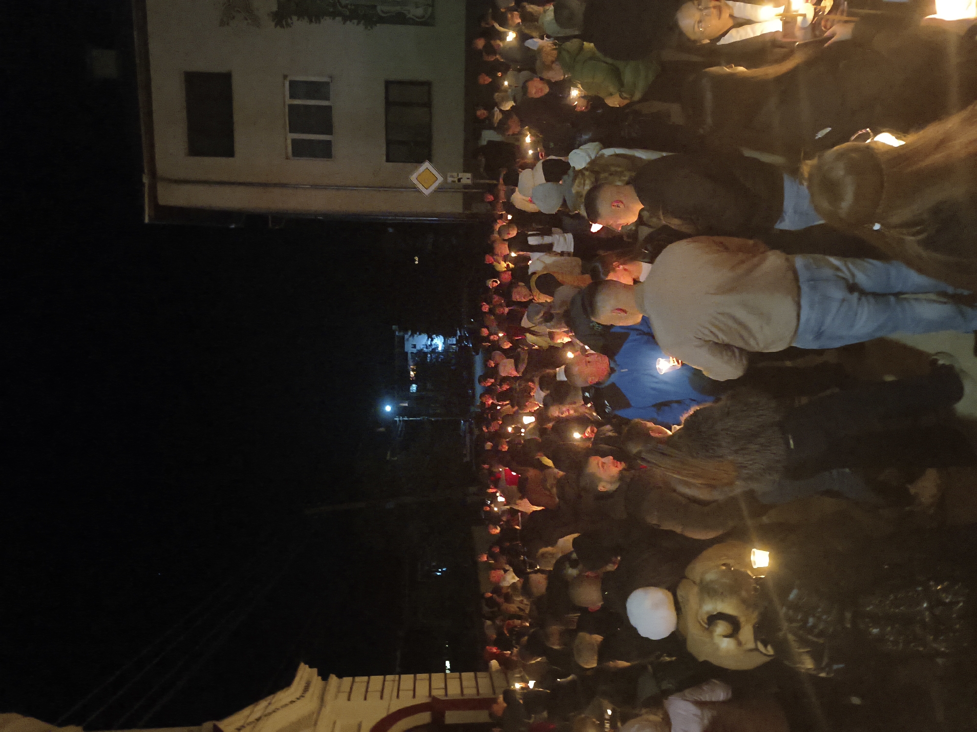 At night in Berkovitsa, Bulgaria, a large crowd of people holds lit candles, suggesting a procession or vigil. They are gathered on a street next to a building with lit windows and a road sign. The scene is illuminated by the candles and streetlights. People wear various clothing.
