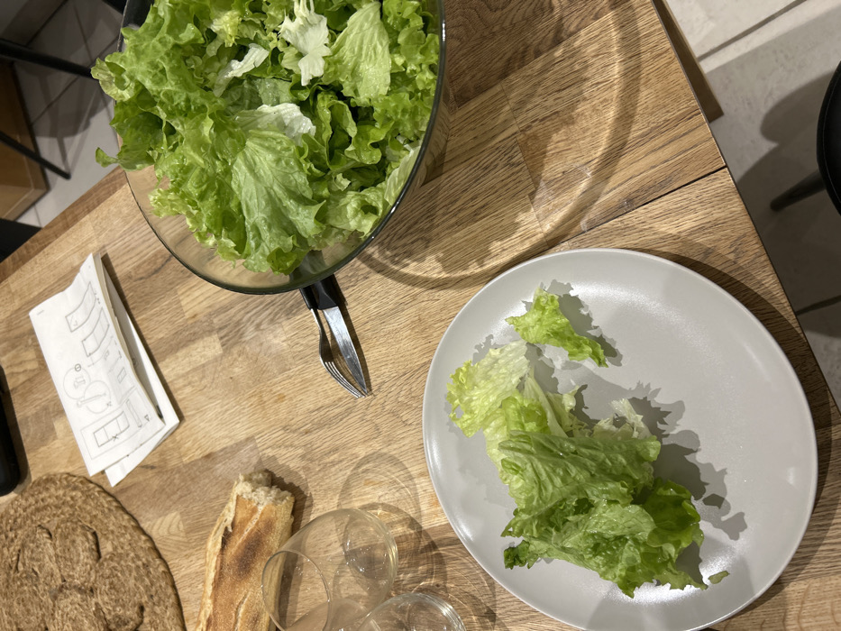 An overhead shot reveals a wooden table with a bowl of lettuce, a plate with some lettuce, a piece of baguette, two wine glasses, and a set of silverware. A paper with instructions lies to the left, and a woven mat is near the bread. The bowl of lettuce is overflowing, while the plate holds a smaller portion. Shadows add depth to the composition.
