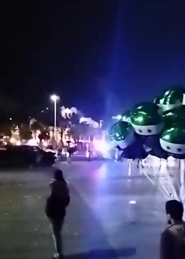 scene at night, possibly in a city center, with a clock tower visible on the left side of the frame. Several people are gathered on a street or plaza, some of them moving around. There is a motorcycle parked nearby. A person in the foreground holds a bunch of green and white balloons. The background is illuminated by streetlights and car headlights, and a vehicle is visible amidst the crowd. The overall atmosphere seems active, with people milling around in the public space.