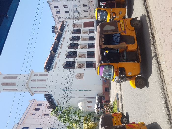 The image depicts a daytime urban street scene in Majengo ward, Kenya, under a clear blue sky. Dominating the background is a prominent white multi-story building featuring a distinct minaret with patterned windows, indicative of a mosque or Islamic cultural center. This building displays arched windows on its lower levels, rectangular windows with dark shutters on upper floors, and a rooftop balcony area. To the left, a section of another white building is visible, and to the right, a less ornate, lighter-colored multi-story building with multiple dark rectangular windows. On the asphalt road in the foreground and middle ground are three yellow three-wheeled auto-rickshaws, commonly known as tuk-tuks. The central tuk-tuk, with a brown canopy, is positioned facing slightly left, displaying "TAXI" text on its side and purple trim on its windshield. Its passenger compartment is visible, containing a striped fabric item. A second yellow tuk-tuk is partially visible on the far left. A third yellow tuk-tuk is parked or stationary further to the right, with its passenger door open. Several indistinct figures are discernible on the sidewalk near the base of the prominent white building, some positioned near small white umbrellas, suggesting vendors or pedestrians. Green foliage from a tree or bush is visible near the left side of the main building. Overhead, multiple black power lines traverse the sky. The scene is brightly lit by sunlight, casting shadows.