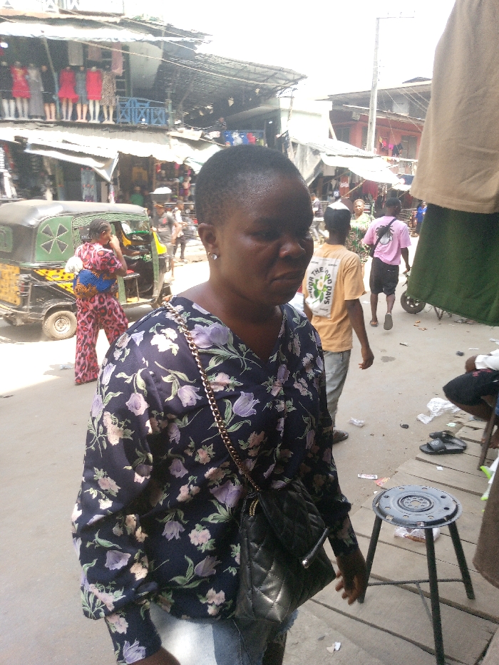 The image depicts a bustling market street in Fegge, Nigeria, with an adult female prominently featured in the foreground