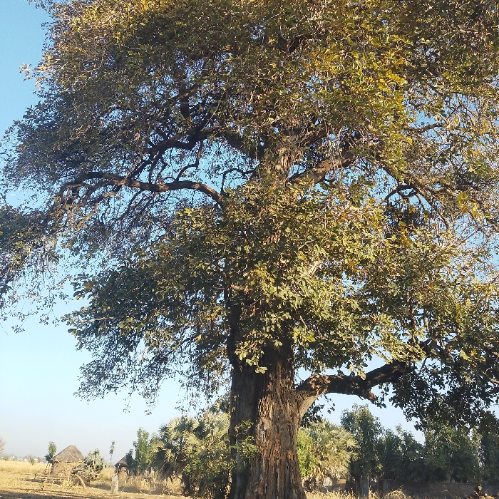 A large, broad tree with dense foliage dominates the frame, its canopy reaching high into a clear blue sky. The massive trunk is deeply textured, casting shadows onto the surrounding dry, grassy landscape. In the distance, small huts and other trees dot the horizon under a pale, sunlit sky. The overall scene suggests a warm, possibly arid, climate.