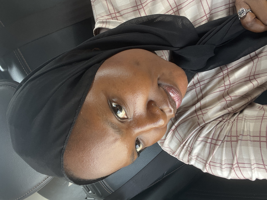 An adult female, identified as being in Ikota, Nigeria, is depicted in a close-up, chest-up shot within what appears to be the interior of a vehicle. She possesses dark skin, dark eyes reflecting ambient light, and appears to be smiling subtly with lips bearing a reddish-brown gloss. Her head is covered by a black hijab, and she wears a light-colored, long-sleeved garment featuring a patterned grid of thin red lines. A silver-toned ring with a dark, intricate design is visible on the ring finger of her right hand, which is positioned near her chest. The background consists of dark, likely leather or faux leather, car seating and interior elements with visible stitching. The subject is looking directly towards the camera.