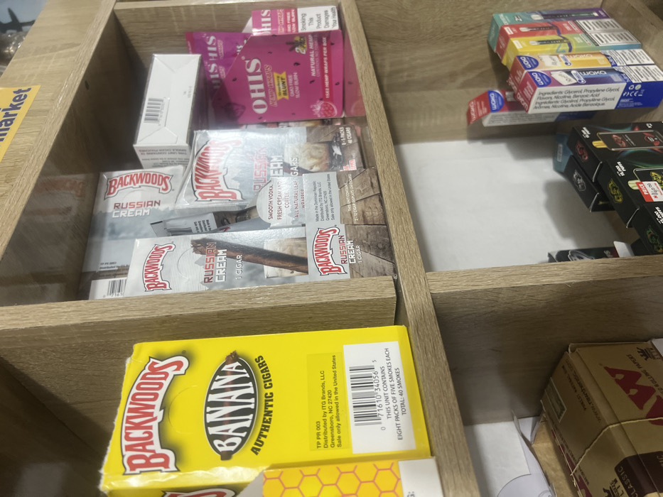 The image presents a detailed, close-up view of a retail display shelf stocked with various tobacco and vaping products. The shelving unit is constructed from light brown wood or laminate, organized into distinct compartments. On the upper and middle shelves, several brands of cigars and hemp wraps are prominently featured. These include multiple boxes of "Backwoods Banana Authentic Cigars" in yellow packaging. One visible "Backwoods Banana" box displays a barcode and text stating, "THIS UNIT CONTAINS EIGHT PACKS OF FIVE SMOKES EACH TOTAL: 40 SMOKES," along with "Distributed by ITG Brands, LLC Greensboro, NC 27420" and "Sale only allowed in the United States." Adjacent to these are numerous boxes of "Backwoods Russian Cream" cigars, identified by silver/white packaging, available in single-cigar packs and multi-packs with descriptions like "SMOOTH VODKA FRESH CREAM AND COFFEE ALL NATURAL LEAF WRAPPED." Additionally, pink packaging for "OHIS HEMP WRAPS" is visible, advertising "STRAWBERRY BLUNT" and "NATURAL HEMP," often in "2 PACK" configurations. A partial yellow sign with blue lettering spelling "market" is visible at the very top edge of the image. The bottom shelf displays brown cardboard boxes, one partially labeled "RAW CLASSIC," suggesting rolling papers or similar accessories. To the right on this shelf, a collection of colorful, upright disposable vape devices branded "WOKO" are visible, alongside other darker boxed vape products indicating "15,000 PUFFS." No individuals are present in the scene. The background behind the shelves is a plain white wall. The specific location within the city of Lokoja, Nigeria, cannot be ascertained from the visual evidence provided.