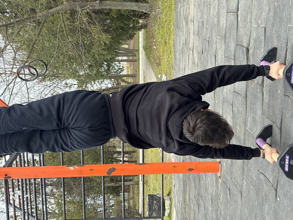 An outdoor scene depicts a male individual, appearing to be a young adult, performing a handstand on two black and purple Qorioric-branded push-up/parallette bars. The individual is inverted, wearing a black hooded sweatshirt with a subtle textured pattern on the upper back and black sweatpants. A black wristband is on the left wrist, and a metallic-colored bracelet is on the right wrist. The ground is covered with grey interlocking rubber or concrete tiles. To the immediate left, a rusted orange metal exercise frame is partially visible, behind which stands a black trash can with a liner. The background features a park-like environment with green grass, a paved pathway, and numerous trees, including both bare deciduous trees and evergreen conifers. Two metal rings hang from a chain on a tree branch to the right. The sky is overcast. This scene is located within an outdoor public exercise area or park in Unknown, Unknown.
