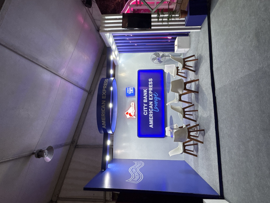 The image depicts an unoccupied temporary lounge or event booth, likely situated within a large tent structure, identifiable by its white fabric ceiling and exposed metal support beams. The setting is the "CITY BANK AMERICAN EXPRESS Lounge," confirmed by prominent branding elements, indicating its location in Dhaka, Bangladesh. The lounge area is carpeted in grey and features two circular glass-topped tables, each surrounded by three empty white modern chairs with light wooden legs. A blue wall on the left displays a white "AMERICAN EXPRESS" wavy logo. The central back wall is light grey, featuring a circular blue overhead sign with "AMERICAN EXPRESS" text and embedded spotlights. Below this, a red neon-style "city bank" logo is positioned to the left of a blue "AM EX" logo. The focal point of the back wall is a large, backlit blue rectangular sign with white text reading "CITY BANK AMERICAN EXPRESS Lounge," with "Lounge" in a script font. To the right of the main lounge area, a vertical panel with blue and white stripes is visible. A black flat-screen monitor is mounted on the white section of this panel. Below the monitor, a small green potted plant rests on a blue rectangular block, adjacent to a white cuboid stand. A white oscillating stand fan is positioned between the seating area and this striped panel. An industrial-style light fixture hangs from the tent ceiling, which also exhibits sections of purple ambient lighting. The scene is devoid of people or discernible activity.