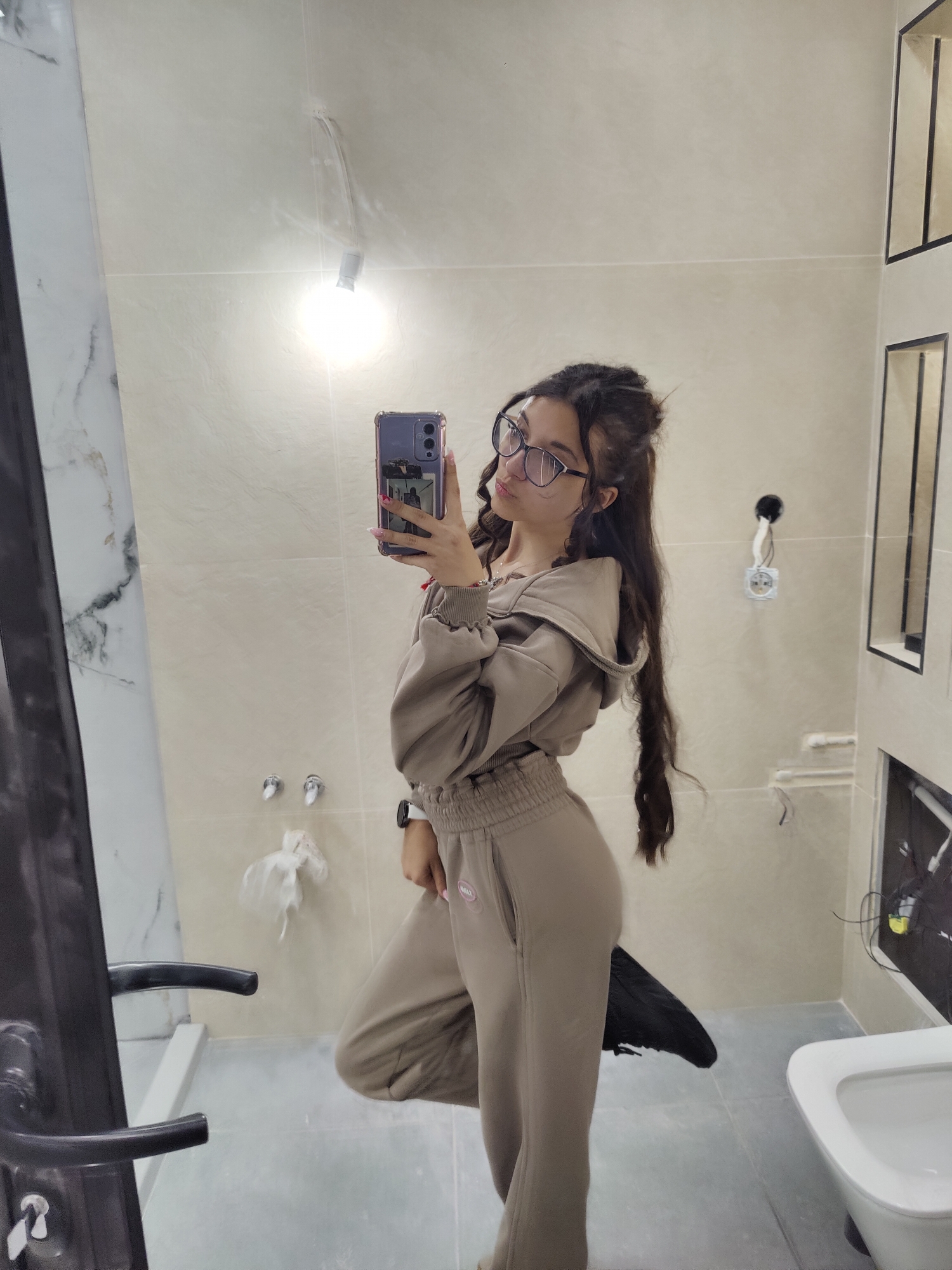 A young woman stands in a bathroom, taking a selfie with her phone. She is wearing a light brown hoodie and matching sweatpants, and glasses. The bathroom is under construction. The walls are tiled in beige, and there are exposed wires and plumbing fixtures. A toilet is visible in the background. I cannot place this bathroom in the city of Plovdiv, Bulgaria.