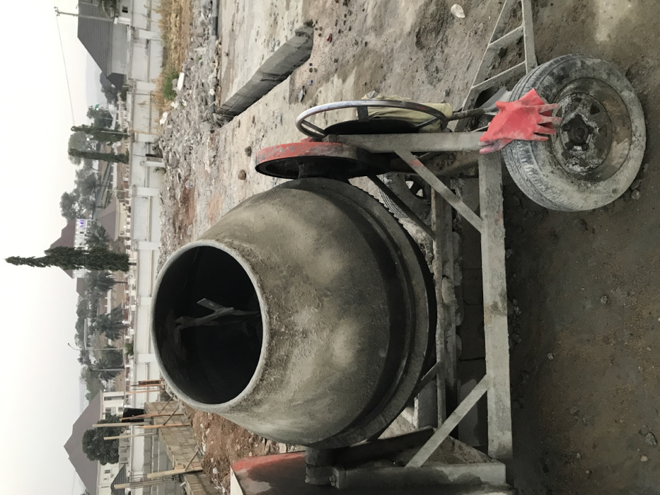 A concrete mixer dominates the frame on a construction site