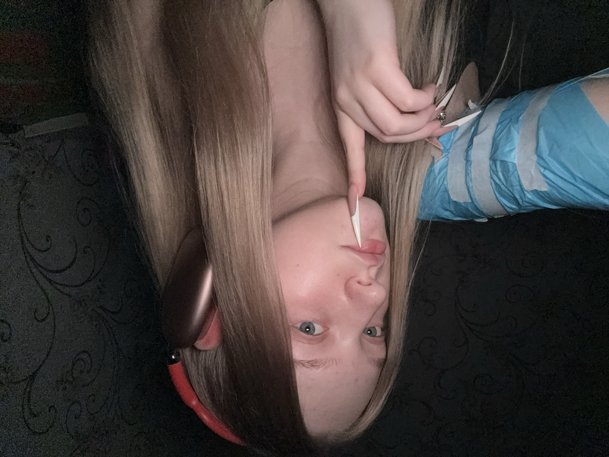 A woman with blonde hair and blue eyes is shown in a close-up, inverted perspective. She is wearing headphones and a blue, taped-up arm covering. Her right hand is visible, featuring long, white pointed nails and a ring. The background is dark and patterned. The location is not identifiable as Saratov, Russia from the visible features.