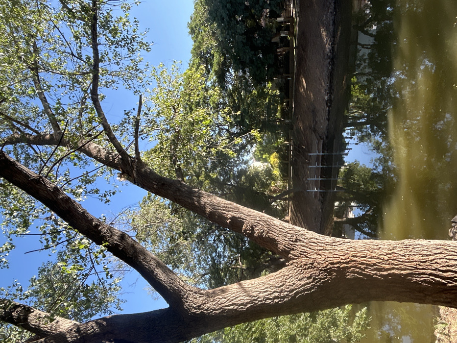 The image displays an outdoor daytime scene located in Culiacán Rosales, Mexico, featuring a body of water and lush vegetation. A prominent tree with a bifurcated trunk, exhibiting textured brown bark, occupies the left and central-left foreground. Its branches, covered with green leaves, extend into the upper frame against a clear, bright blue sky. A calm, greenish-brown waterway, consistent with a river or canal, runs horizontally through the midground, reflecting the sky and surrounding trees. On the far bank, an area of cleared dark earth is visible, from which a small, light-colored dock or pier structure, composed of several vertical posts and a horizontal surface, extends into the water. The far bank is densely lined with numerous green trees, and indistinct structures are partially visible through the foliage in the distant right. No individuals, animals, or specific actions are discernible within the frame.