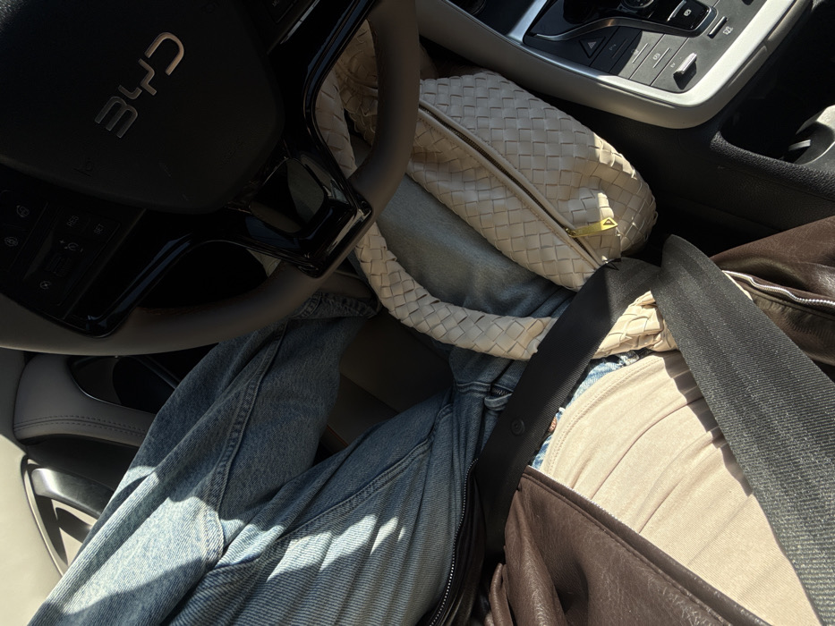 person seated in a car, as indicated by the steering wheel featuring a "BYD" logo and a seat belt across their body. They are wearing light blue jeans. A beige, woven handbag rests on the passenger seat beside them. Also visible is a dark brown leather jacket. The car's console can be seen near the top right corner.