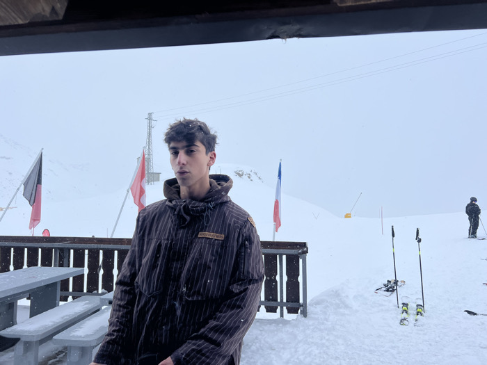 The image depicts an outdoor, snow-covered scene identified as Valtournenche, Italy, under active snowfall. A young male, positioned slightly left of center, stands facing the camera. He has dark, wavy hair and wears a dark brown, vertically striped hooded jacket with a rectangular patch containing text on its upper right chest area. Snowflakes are visible on his hair and jacket. To the subject's left, a wooden picnic table with benches is partially covered in snow. A dark wooden railing forms a barrier behind the subject and the table. Beyond the railing, three flags are visible: a black and red flag on the left, a red and white flag to its right, and a French national flag (blue, white, red vertical stripes) further right. A metal lattice transmission tower or ski lift pylon stands in the mid-ground, left of center. On the right side of the frame, two sets of skis with poles are upright in the snow. Further into the background, another individual in dark ski attire is visible, standing on skis and facing away from the viewer on a snow-covered slope. The entire background consists of snow-covered mountainous terrain under an overcast, light gray sky, with numerous snowflakes visible throughout the air. Yellow and red ski markers are sparsely distributed on the distant slope.