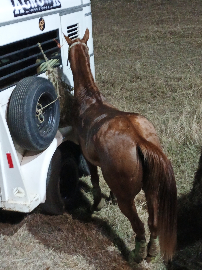 A brown horse stands near a white horse trailer. Its head is turned towards the trailer, where a spare tire is visible. The horse has a long neck and tail. Leg wraps are on its back legs. The ground is dry grass. The trailer has an emblem on its top left and vent slots on the side. A rope and what appears to be hay are tied to the trailer.