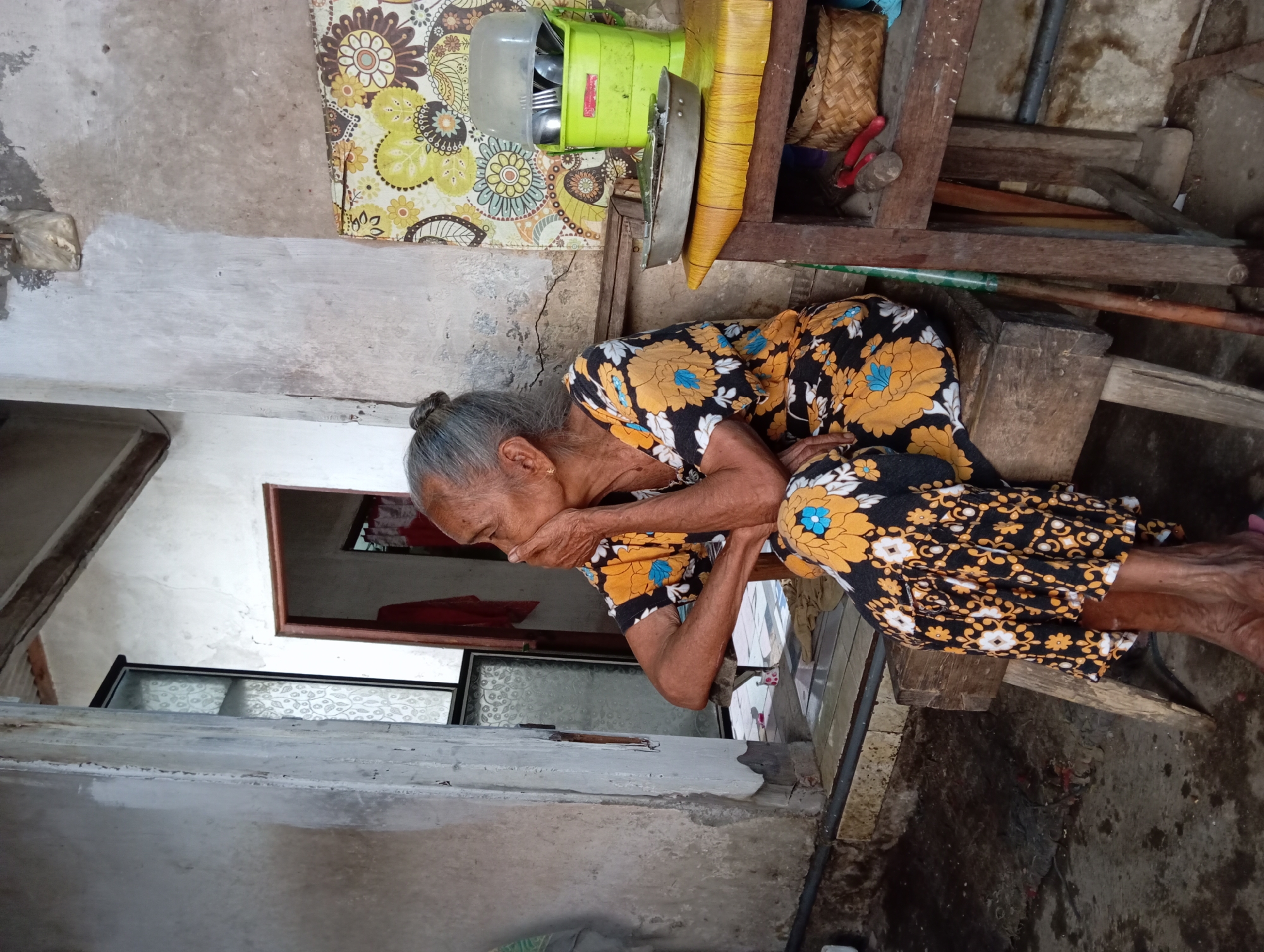 The image depicts an elderly woman seated on a wooden bench inside a dwelling in the city of Baron, Indonesia