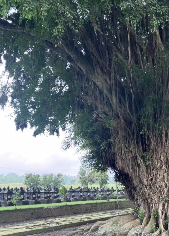 large banyan tree with long, hanging aerial roots dominating the foreground. Behind the tree, there is a low stone wall topped with decorative elements running horizontally across the middle ground. Beyond the wall is a field with some smaller trees and a backdrop of hazy hills or low mountains under a cloudy sky. The ground beneath the tree is a mix of dirt and stone pathways. The overall scene is peaceful and naturalistic.