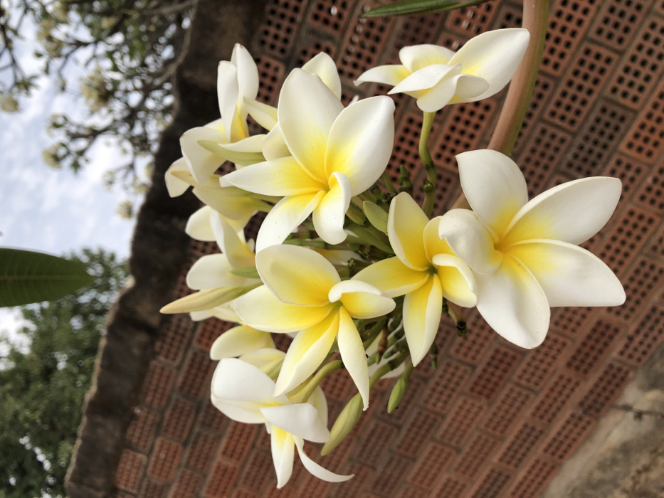 The image displays a close-up, upward-angled view of a cluster of white and yellow Plumeria flowers, likely located in Jos, Nigeria. The flowers are in full bloom, featuring five broad, rounded petals that are bright white at their outer edges and transition to a vibrant yellow in their centers. Multiple buds, some with green calyces, are also visible within the cluster, indicating ongoing growth. The flowers are attached to a stout, green stem. In the background, a reddish-brown brick wall constructed in a stretcher bond pattern is partially visible and slightly out of focus, running diagonally across the lower half of the frame. Above the wall, a darker, blurred concrete or stone coping is discernible. Further beyond, a blurred expanse of green foliage from other trees and parts of another Plumeria branch with flowers can be seen against a light blue, partly cloudy sky. The lighting suggests natural daylight conditions. There are no people, actions, or direct interactions depicted.
