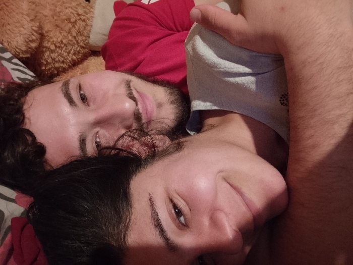 The image depicts two individuals indoors, located within the city of Roman, Bulgaria. One subject, characterized by dark, curly hair, a beard, and a mustache, is shown wearing a red top. Their head is positioned towards the left side of the frame, with their face angled towards the viewer, displaying a smiling expression. Adjacent to them and slightly below is a second subject with dark, straight hair, wearing a light grey top that features a small dark, patterned emblem on the left chest area. This individual's face is also angled towards the viewer, presenting a smiling expression. The right arm of the first subject is visible, extending over the upper torso of the second subject. In the upper left background, a large, light brown teddy bear is partially visible, resting on a patterned fabric with black and white wavy lines. The scene suggests a domestic environment.