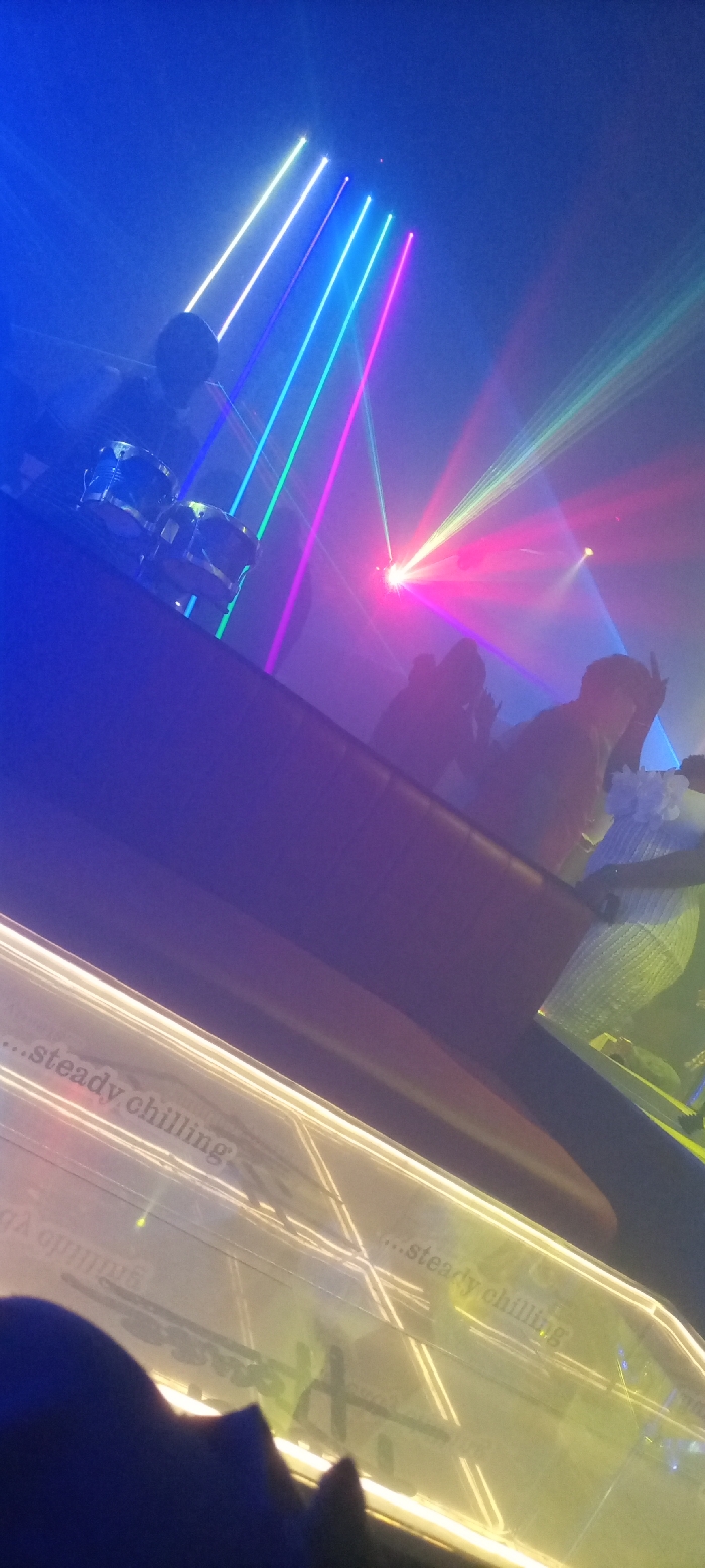A vibrant nightlife scene unfolds, with laser beams of white, blue, pink, and green slicing through the smoky atmosphere. A drummer is positioned on the left, while silhouettes of people mingle further back. "Steady chilling" is illuminated on a glass surface in the foreground, adding an urban vibe to the scene. The overall impression is one of energy and relaxation within a club setting.