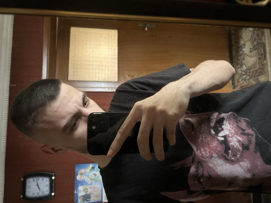 The image captures a male individual taking a mirror selfie in an interior residential room