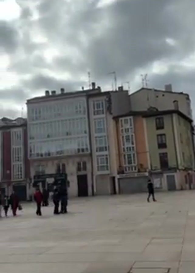 plaza surrounded by buildings on a cloudy day. People are walking across the plaza. The plaza has a tiled surface. The buildings vary in color and architectural style, some with balconies and large windows. The sky is overcast with patches of blue visible between the clouds.