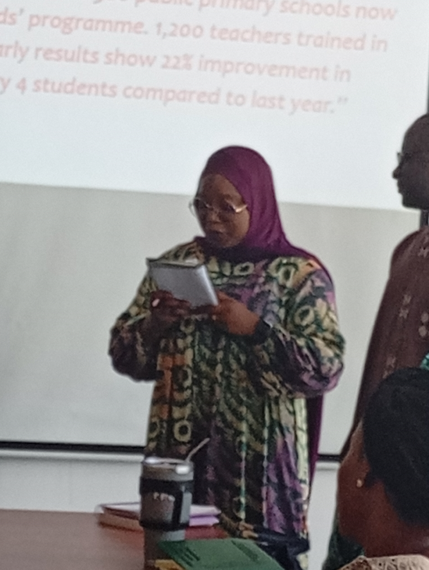 A woman wearing a purple hijab and patterned dress stands and looks at a silver tablet she is holding in her hands. To her right is another person wearing a patterned brown shirt, partially cropped in the image. A table is in front of the woman with a water bottle and some papers on it. Behind the woman, a projection screen displays text that includes percentages and references to teachers and students. The location, Dadi Riba, Nigeria, is not discernible from the image.