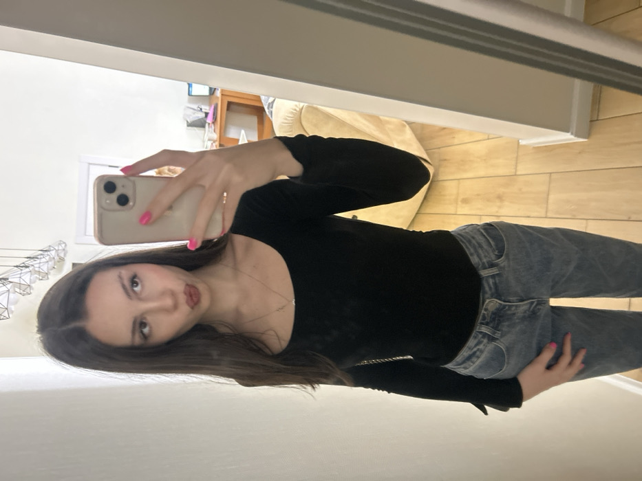 A female subject is depicted in a mirror selfie taken indoors in Novosergievka, Russia