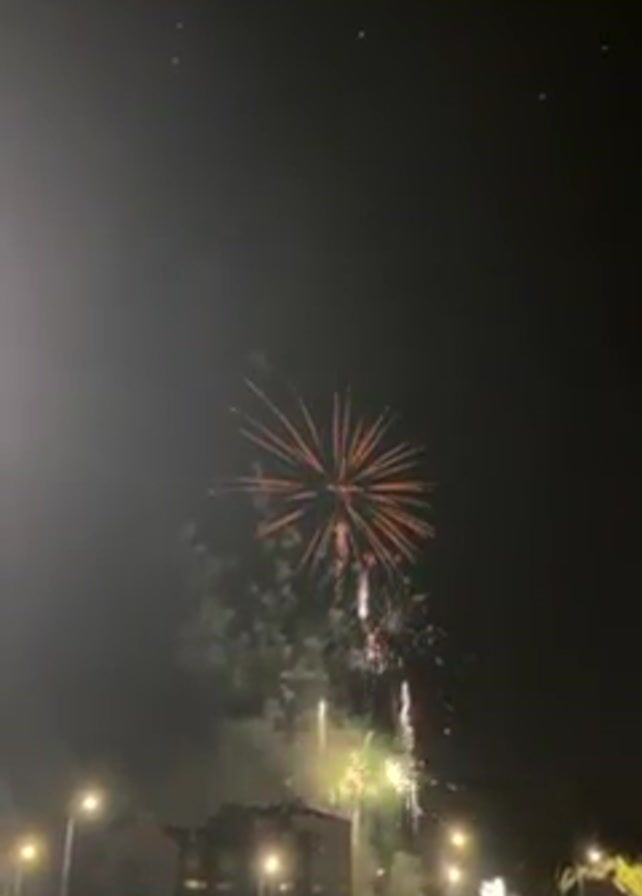 At night, a fireworks display is occurring above a parking lot full of cars. Streetlights illuminate the parking area. The fireworks explode in various colors, including red, green, gold, and white, with multiple bursts and patterns. Smoke from the explosions fills the sky, obscuring the stars. Distant buildings are visible along the horizon. The sound of the fireworks is loud.