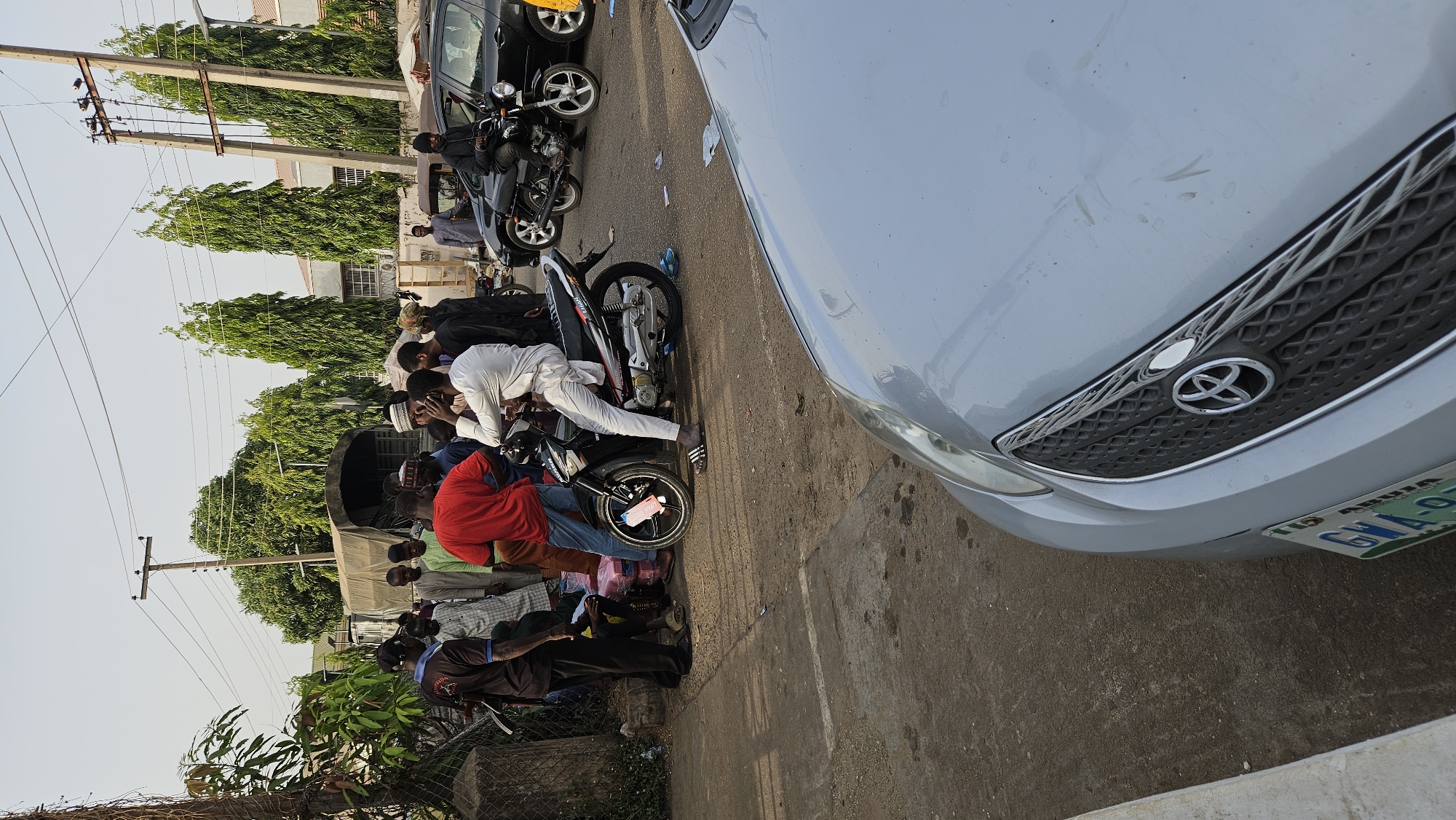In Maiburiji, Nigeria, a group of approximately ten people are gathered near motorcycles parked along the side of a street. One person dressed in white appears to be examining or working on a motorcycle. A silver-colored Toyota car is parked nearby, taking up a significant portion of the foreground. The license plate is partially visible. The surrounding environment consists of buildings, trees, and overhead power lines. The scene appears to be on a street or road.