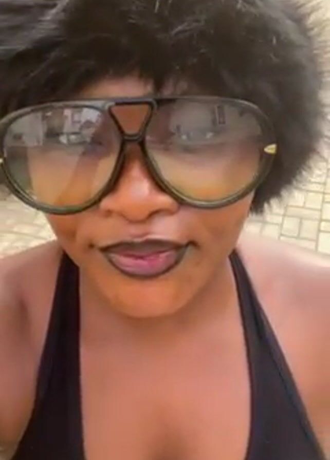 A woman is facing the camera in an outdoor setting. She is wearing a black tank top, a large pair of tinted aviator sunglasses, and a large furry black hat. The background consists of a brick-paved street and houses. The woman is smiling slightly. The camera is held at a close distance and appears somewhat shaky.