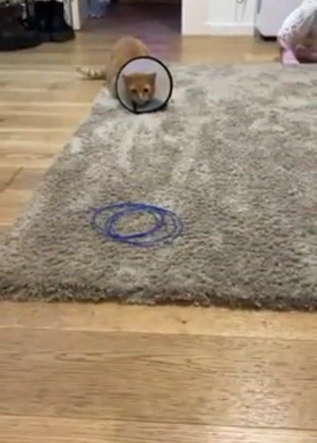 n orange tabby cat wearing a cone of shame, in a living room. The room has light-colored wooden floors, and the cat is on a gray shag rug. There are three blue rubber bands on the rug in front of the cat. The cat walks forward and rolls over onto the rubber bands. A small child is seen in the background on the rug, to the cat's right. The room also has a doorway with visible items inside and a white air purifier in the background.