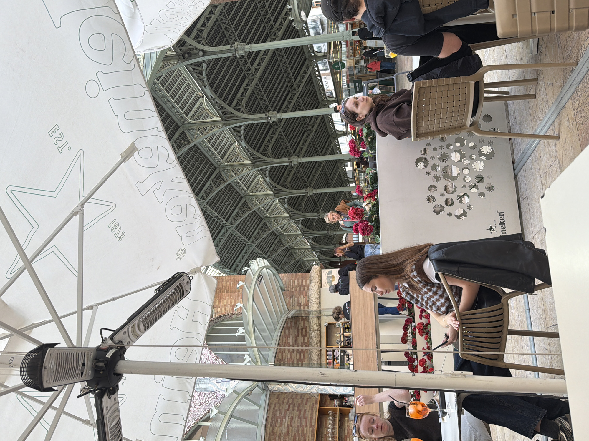 The image captures an outdoor cafe scene, potentially in Valencia, Spain, judging by the building's architecture. Several people are seated at tables, some engaged in conversation. One woman is looking at a device. A white patio umbrella, branded with the "Heineken" logo, provides shade. The cafe appears to be adjacent to a market or public space with high ceilings and ornate metalwork. Red flowers are a prominent decorative element. The lighting appears to be bright daylight.