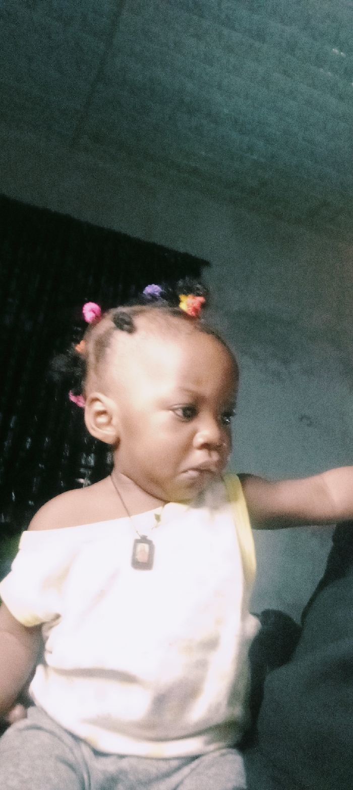 A young child with braided hair adorned with colorful hair ties poses in a slightly blurry photo. The child wears a light-colored top and a necklace with a rectangular pendant. The background features a dark, possibly textured wall on the left and a light-colored wall on the right. A dark object is visible to the right of the child. The child's expression appears serious or contemplative.