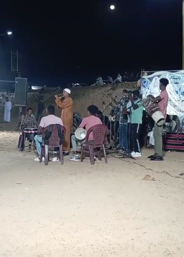 A group of about 12 people are performing live music outdoors at night. The scene is lit by overhead streetlights and the moon. At the front of the group, a man in a light-colored robe and white hat plays a flute. Three men are seated in chairs facing the musicians. To the right, a man in a pink shirt plays a drum. The other musicians are playing various wind instruments, including trumpets and a saxophone. A speaker is set up behind the seated men. Behind the musicians, there is a slight embankment with a crowd of people sitting and standing. There is a sign or banner in the background, partially obscured. The ground is sandy.