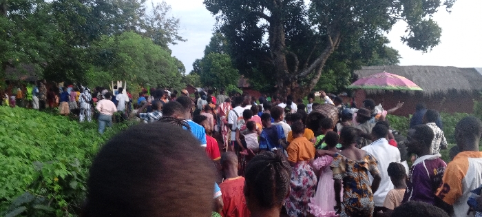 A large group of people congregates outdoors, appearing to walk along a path bordered by lush green vegetation. Most individuals are wearing casual clothing in various colors. A sizable tree looms in the background, with a house featuring a thatched roof and a pink umbrella visible nearby. The scene evokes a sense of community gathering or a procession of some kind, possibly a celebration or event.