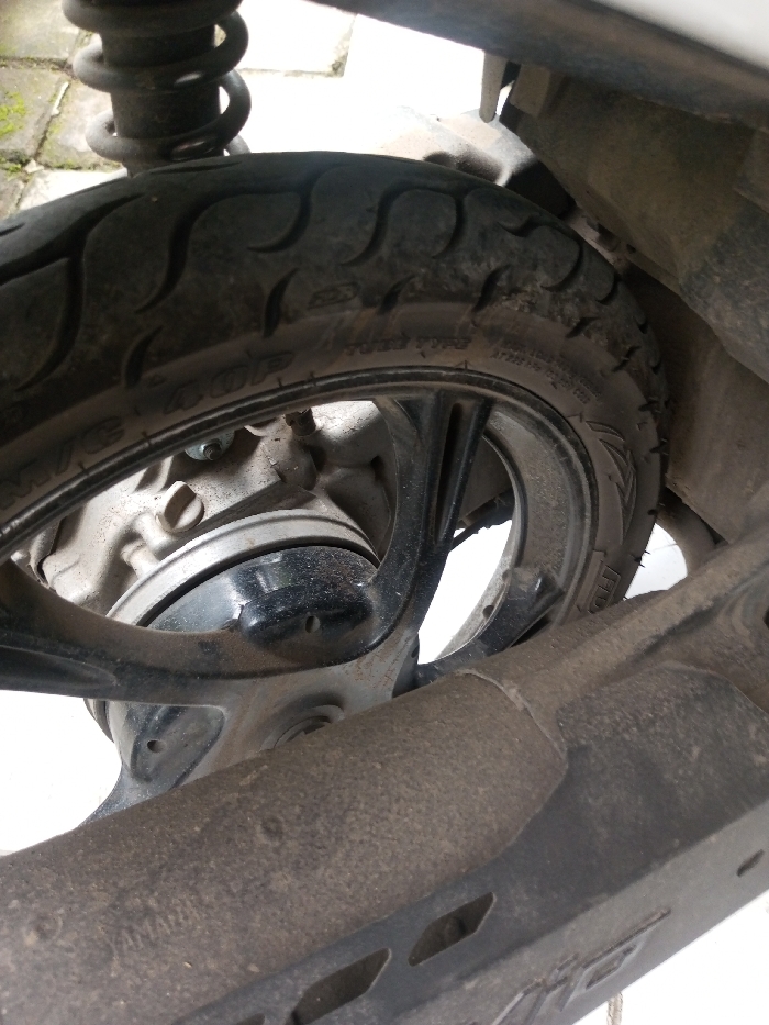 - "The image displays a close-up, angled view of the rear wheel and associated components of a dusty Yamaha scooter or motorcycle, located in Bhendala, India" by FM-B8aSi2, licensed under CC BY 4.0