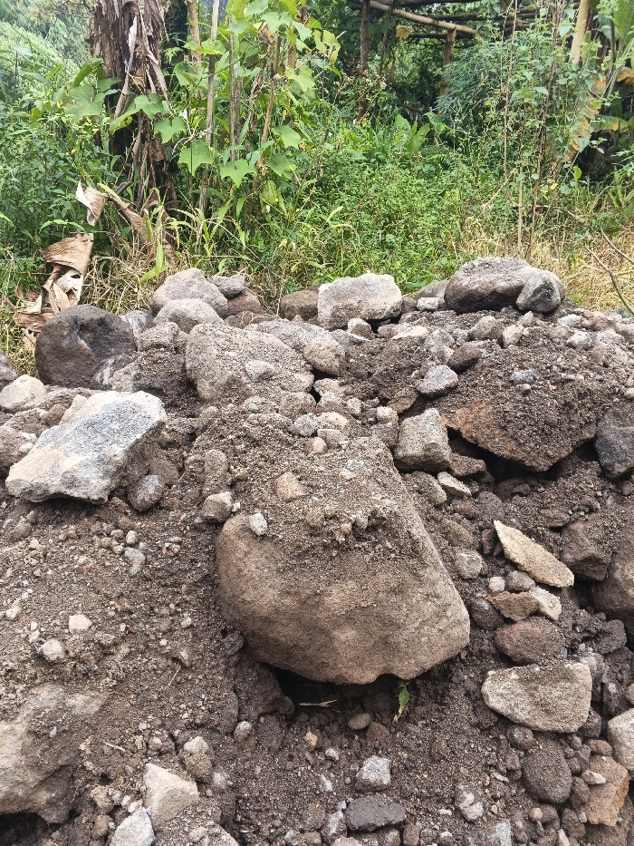 The scene is an outdoor environment in Makilala, Philippines. The foreground is dominated by a substantial pile of dark brown soil intermixed with numerous unhewn rocks of varying sizes, primarily in shades of gray and brown. The rocks range from small pebbles to larger, irregular stones, many showing adherence of soil. Directly behind this pile, the midground and background consist of dense, wild green vegetation, including broad-leafed plants, grasses, and what appears to be dried, light-brown plant material resembling banana leaves on the left. Faint, slender vertical structures, possibly bamboo or wood, are partially visible within the distant foliage. No individuals, animals, or explicit actions are present within the frame. The lighting suggests natural daylight.