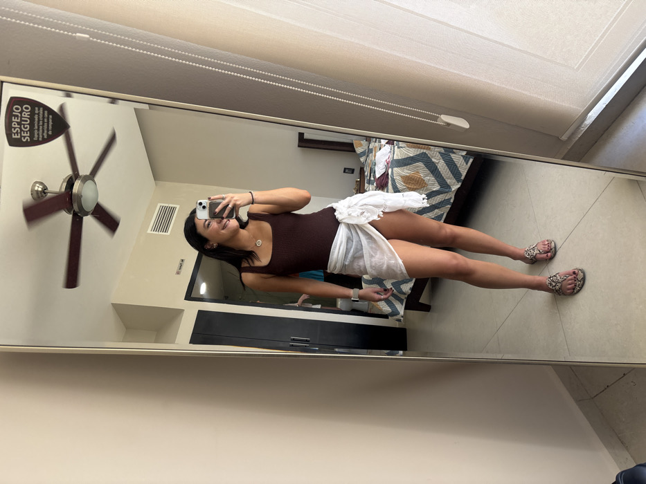 A young woman poses for a selfie in a mirror. She wears a brown, square-neck, one-piece swimsuit and a white sarong tied at her hip. She is barefoot, wearing patterned sandals. The background shows a bedroom with a bed and a ceiling fan. The mirror is rectangular with a silver frame and has a sticker at the top left. The room is well-lit.