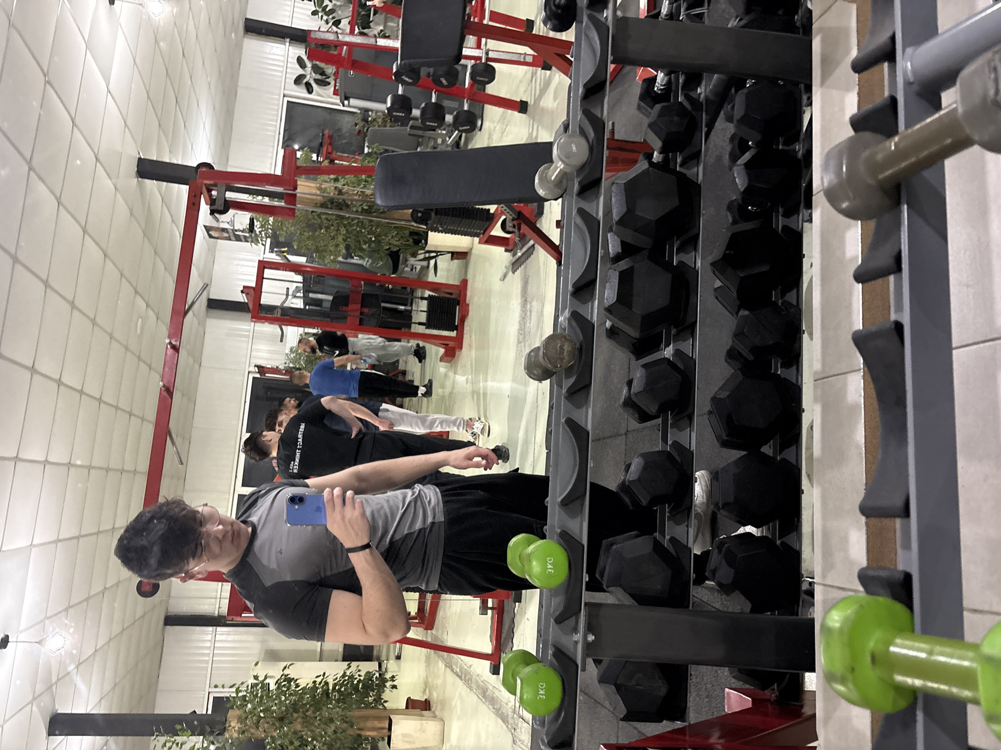 The image depicts the interior of a fitness center, specifically a gym located in Sandanski, Bulgaria, as viewed through a mirror. In the immediate foreground, a dumbbell rack occupies the lower half of the frame, displaying various dumbbells including two prominent green 3kg spherical dumbbells, a pair of lighter grey cylindrical dumbbells, and multiple black hexagonal dumbbells arranged on tiered shelving. The primary subject, a male individual with dark hair and glasses, is positioned centrally, taking a mirror selfie using a light blue smartphone held in his right hand. He is wearing a short-sleeved athletic shirt that is dark grey on the upper chest and shoulders, transitioning to a lighter grey mid-torso, paired with black athletic pants. His left forearm displays a black wristband. Reflected in the background, several other male individuals are present within the gym. One man, wearing a black t-shirt with the reversed text "ABSTRACT THINKER" visible, stands to the right of the primary subject. Other figures in athletic wear are partially visible further back, engaged in unspecified activities. The gym environment features white tiled ceilings with square panels and embedded lighting, along with several overhead pendant lights. The floor is light-colored and tiled. Red-framed gym equipment, including weight racks, benches, and weight machines with black components, are distributed throughout the space. Potted green plants are strategically placed, adding to the interior decor.