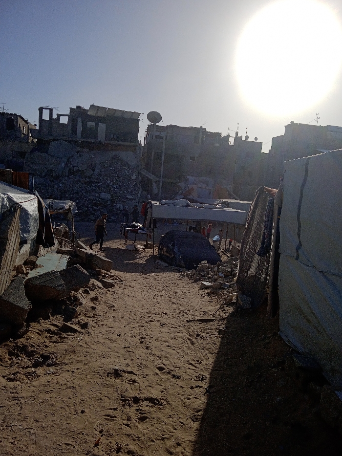 - "The image depicts a scene of extensive urban destruction and makeshift living conditions in Khan Yunis, Palestinian Territory, under a bright, high-intensity sun" by FM-taMrd2, licensed under CC BY 4.0