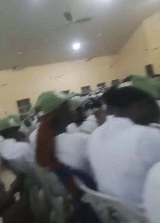 room full of people wearing white shirts and green hats, likely attending an event or ceremony. The room is large with rows of white plastic chairs, and a sign is visible in the background, though the text is not clear. The ceiling has visible lighting fixtures and fans. The focus is mainly on the backs of the people, and there is some movement and cheering heard in the background.