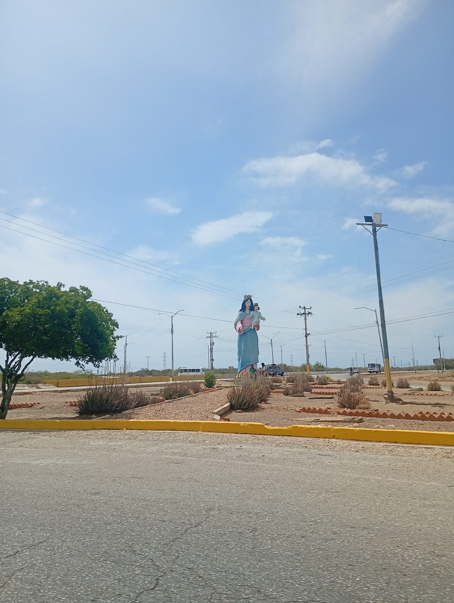 The image displays an outdoor, daytime scene in La Guardia, Venezuela. A grey asphalt road with visible cracks occupies the lower quarter of the frame. Above this, a bright yellow curb separates the road from a landscaped median featuring dry, bushy, succulent-like plants arranged in rows within reddish-brown gravel beds, some bordered by terracotta-colored edgings. The central subject is a large, multi-colored statue positioned slightly left of center in the median. The statue depicts a crowned female figure, clad in a pink bodice and light blue robe, holding an infant. Near the base of this statue, several dark, indistinct shapes suggest human presence, but specific individuals or actions are not discernible. To the far left, a deciduous tree with green foliage partially obscures the background. Numerous utility poles and streetlights punctuate the midground and background. One prominent light grey utility pole stands to the right of the statue, fitted with two black solar panels and a light fixture. Power lines traverse horizontally across the upper midground. In the background, a light-colored bus and several smaller, indistinct vehicles are visible on a distant road. The distant landscape is flat and arid, with sparse vegetation, extending to a hazy horizon under a light blue sky dotted with scattered white cumulus clouds.
