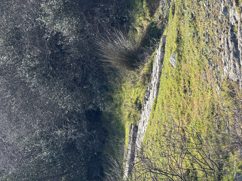 The image depicts a sloping, vegetated hillside within the city of Therma, Greece, under clear daylight conditions. No human or animal subjects are visible. A section of an ancient-looking stone-paved path, constructed from irregular, flat grey stones, diagonally traverses the mid-ground from the lower-left towards the upper-right. This path is partially covered by loose stones and earth in some sections. The hillside is covered predominantly by bright green grass, interspersed with patches of drier, lighter green or yellowish vegetation. In the background, dense, dark green and brown scrub or bushes with numerous bare branches form a thick, shadowy mass, ascending the slope. A prominent clump of tall, spiky, dry-looking grass or reeds is situated to the right of the stone path, near the center-right. Scattered smaller rocks and exposed soil are visible in the foreground and around the path. The scene is brightly lit by natural sunlight, casting subtle shadows.