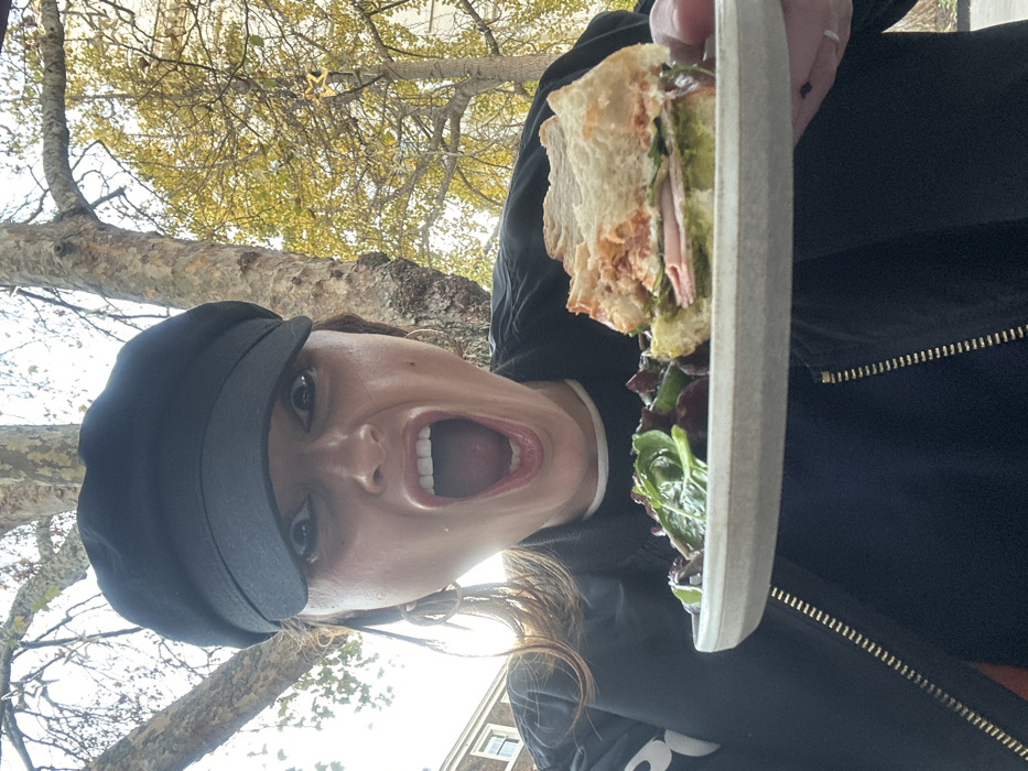 A woman with brown hair, wearing a black newsboy cap, a black zippered jacket, and gold hoop earrings, is captured in a close-up, low-angle shot. Her face is centered, with eyes wide and mouth open in an exaggerated expression, seemingly looking directly at the camera. Her right hand, partially visible, holds a light-colored plate positioned centrally below her face. The plate contains a half-eaten sandwich on rustic bread, featuring green pesto, deli meat, lettuce, and a reddish spread, alongside a small side salad of mixed greens. The background consists of several large trees with mottled bark and branches displaying sparse, yellowish-green autumn foliage, indicative of a park or street in an urban environment. A light-colored building with dark window frames is partially visible in the upper left background. The scene is consistent with an outdoor setting within the City of Westminster, United Kingdom.