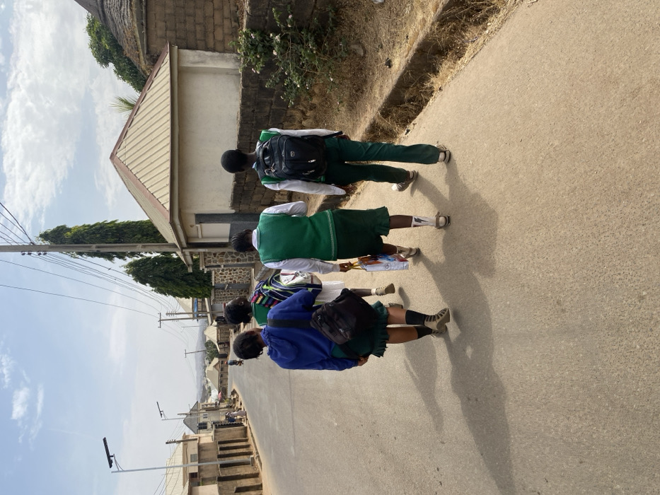 Four individuals, likely students, are depicted walking away from the camera on a paved road in a residential area of Jos, Nigeria, under a bright, sunny sky