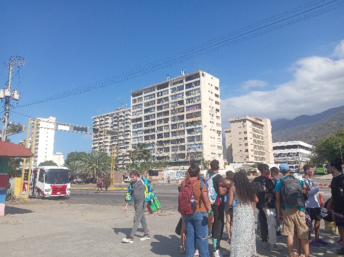 This image depicts a sunny urban landscape in Caraballeda, Venezuela. In the foreground, a group of approximately ten individuals, primarily young adults, stands on a paved surface to the right. Many in this group are wearing casual attire and backpacks, suggesting travel or an outing. One male subject, in the mid-ground, walks from left to right, dressed in a grey tracksuit, carrying several brightly colored mesh bags. To the left, a white and red short bus or shuttle vehicle is stationary on the paved street, positioned near a small, multi-colored building with a reddish roof. A utility pole with multiple transformers and overhead power lines stands prominently on the far left. Above the street, metal gantries with blank signal panels are visible. The background is dominated by several multi-story buildings; the most prominent is a tall, light-colored structure with numerous balconies and windows, suggesting residential use. Another similar building is partially visible to its left, and more urban structures extend to the right. Distant green mountains rise under a clear blue sky with sparse white clouds, forming the horizon line behind the city structures. The scene is illuminated by bright daylight, casting distinct shadows.