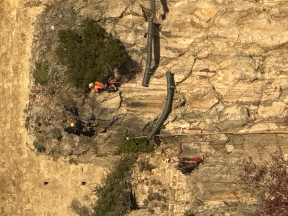 The image depicts a steep, rugged rock face in the city of Monaco, Monaco, illuminated by natural light. Four individuals are engaged in rope access activities on the rock face. At the upper left, two individuals, primarily dressed in dark clothing with one wearing a yellow helmet, are positioned on a small rock protrusion. To their right, a third individual, wearing a bright orange jacket, a yellow helmet, and dark pants, is actively rappelling or ascending the rock face, secured by ropes. In the lower-left quadrant, a fourth individual, wearing a light-colored shirt, red pants, and a yellow helmet, is suspended by ropes against the rock, appearing to be in a paused or resting stance. All individuals are equipped with safety harnesses and helmets. Numerous ropes extend vertically across the rock face, providing access and securing the personnel. Two dark, segmented pipeline-like structures are affixed horizontally to the middle-right section of the rock. Patches of green vegetation, including small bushes, grow from crevices on the rock surface, with additional reddish-brown foliage visible at the bottom left.