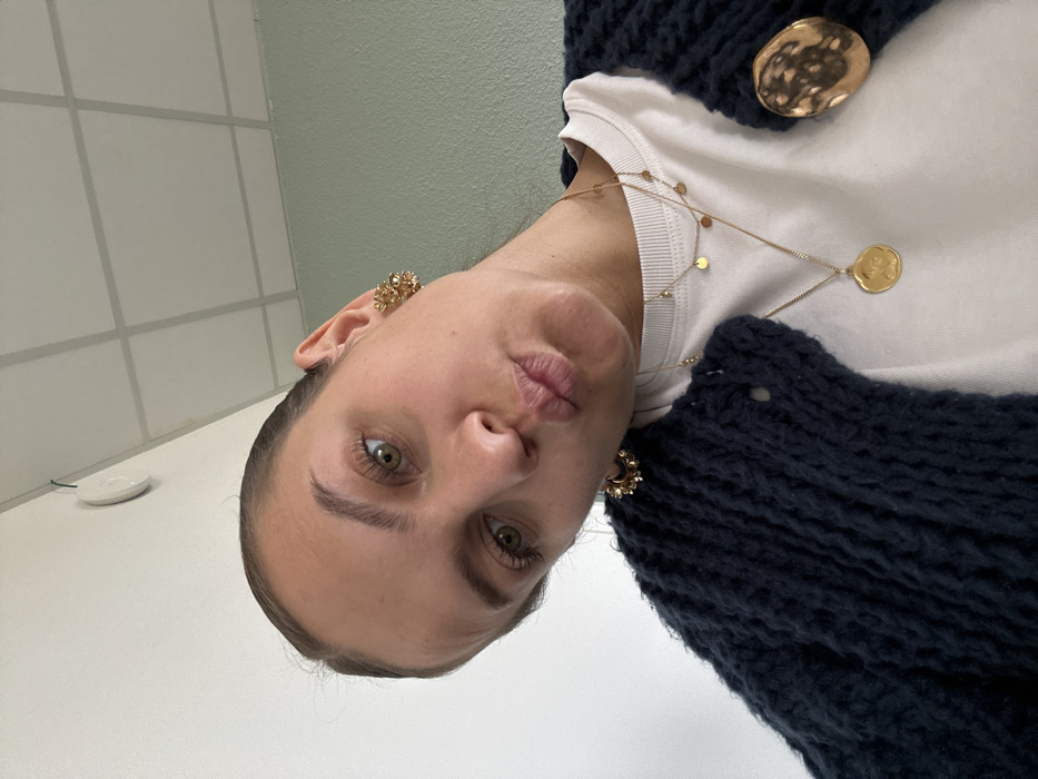 The image depicts a female subject in an indoor environment, identified as being in the city of Saint-Étienne, France. The subject, with fair skin and light hair pulled back, looks directly at the camera with a slight head tilt, making a pouting or kissing gesture with her lips. Her eyes are light-colored, possibly green or hazel. She wears a white top underneath a dark blue, thick-knit cardigan that is unbuttoned. Adorning her are two gold-toned necklaces: a shorter one with multiple small circular charms, and a longer one featuring a single, large, irregularly shaped hammered disc pendant. She wears two distinct gold-toned earrings: one on her right ear appearing as a floral or cluster design, and one on her left ear as a hoop adorned with small spheres. A large, irregular gold-toned brooch is pinned to the left side of her cardigan. The background consists of a white wall on the left and a pale green wall on the right. A white drop ceiling with grid panels is visible overhead. A white, circular device, possibly a smoke detector or sensor, is mounted on the white wall in the upper left, with a thin wire running horizontally nearby.