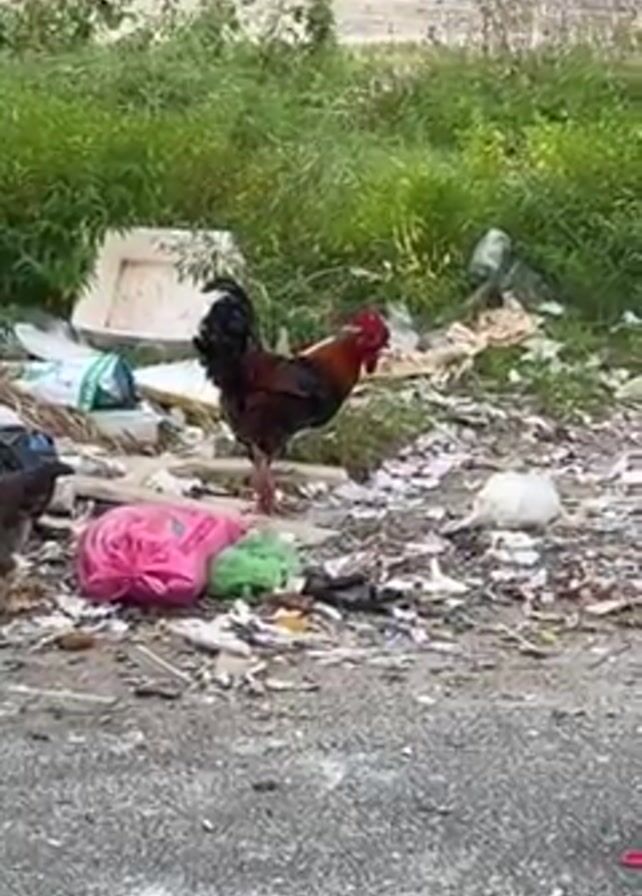 rooster standing amidst scattered trash, with a smaller chicken nearby. The surrounding area includes overgrown vegetation and what appears to be a building or structure in the background. The ground is paved, and overhead wires are visible in the sky. The sky is overcast. The rooster appears to be the focus of the video, as it is prominently positioned and in sharp focus. The trash includes plastic bags, styrofoam, and other discarded items.
