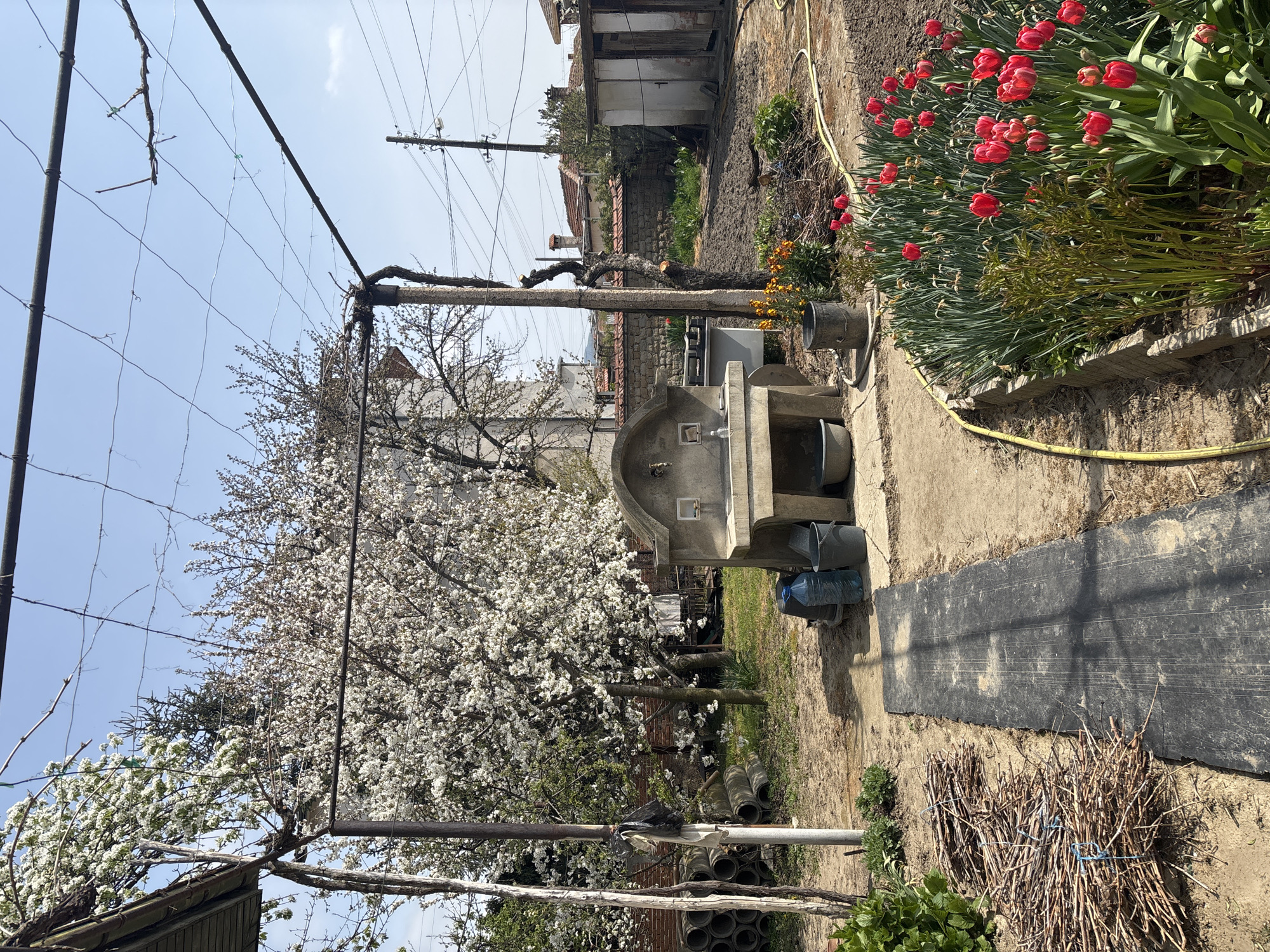 garden in Banya, Bulgaria. A concrete washbasin stands centrally. A blossoming tree is to the left, and a flower bed of tulips is to the right. A stack of cut branches is at the bottom right of the frame. Power lines are visible overhead. There are no people visible. The environment is rural, with a mix of vegetation and buildings.